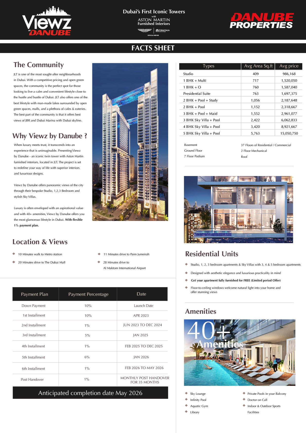 Quando il lusso incontra la fiducia, trascende in un'esperienza inimmaginabile. Presentazione di Viewz by Danube, un'iconica torre gemella con interni arredati da Aston Martin, situata a JLT. Il progetto è destinato a ridefinire il tuo stile di vita con interni superiori e design lussuosi. Viewz by Danube offre viste panoramiche della città attraverso il loro monolocale su misura, 1,2,3 camere da letto e le eleganti ville Sky. Il lusso è spesso avvolto da un valore ambizioso e con oltre 36 servizi, Viewz by Danube ti offre lo stile di vita più glamour di Dubai.
